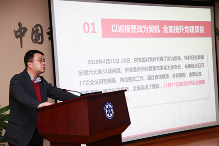 會上,研究所黨委書記、副所長彭輝,黨委副書記、紀(jì)委書記馮埃生,副所長呂雪峰,黨委副書記許輝分別作了分管工作報告,詳細(xì)匯報了2019年分管工作推進(jìn)情況、對分管工作的思考及2020年工作思路?! ?/font>
