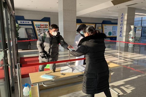 在辦公樓入口登記、測(cè)溫、消毒、發(fā)口罩