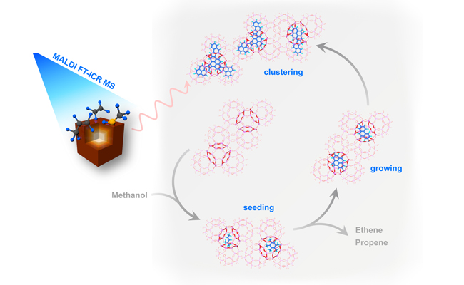 分子篩催化的石油化工(催化裂化、異構(gòu)化等)和煤化工(甲醇制烯烴、合成氣轉(zhuǎn)化等)等工業(yè)過(guò)程在國(guó)民經(jīng)濟(jì)中具有重要地位,因其酸催化特征,催化劑因積碳而失活是普遍現(xiàn)象。需要對(duì)催化劑不斷燒炭再生才能維持其活性,以實(shí)現(xiàn)裝置的長(zhǎng)周期操作。雖然分子篩催化劑積碳失活問(wèn)題一直受到廣泛的重視,但如何使催化劑避免積碳仍然是一項(xiàng)長(zhǎng)遠(yuǎn)的科學(xué)挑戰(zhàn)。要解決這一難題,需要對(duì)催化劑積碳失活的機(jī)理有深入的了解。目前,文獻(xiàn)對(duì)分子篩積碳的認(rèn)知?dú)w納為分子篩內(nèi)部簡(jiǎn)單的稠環(huán)芳烴物種或分子篩外表面生成的石墨化的積碳,難以關(guān)聯(lián)出確切的積碳演變途徑。從分子水平對(duì)積碳物種結(jié)構(gòu)進(jìn)行全譜圖解析并跟蹤積碳物種的演變對(duì)積碳失活和催化劑再生過(guò)程具有重要現(xiàn)實(shí)意義。