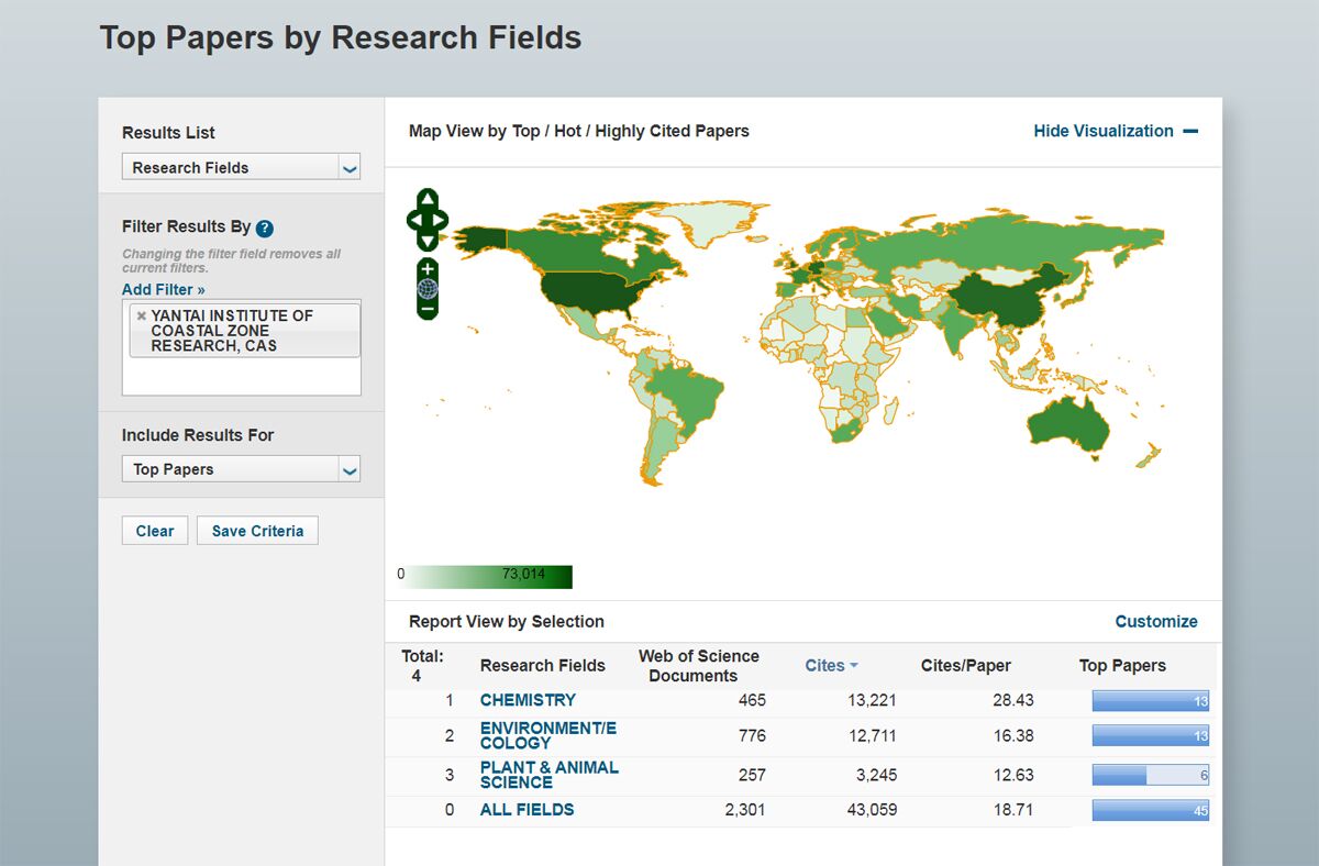 根據(jù)5月14日ESI最新數(shù)據(jù)顯示,中國(guó)科學(xué)院煙臺(tái)海岸帶研究所在動(dòng)植物科學(xué)(領(lǐng)域)進(jìn)入ESI全球機(jī)構(gòu)前1%行列,成為煙臺(tái)海岸帶所繼環(huán)境與生態(tài)學(xué)、化學(xué)后進(jìn)入ESI全球機(jī)構(gòu)前1%行列的又一個(gè)學(xué)科領(lǐng)域。近十年來(lái),煙臺(tái)海岸帶所科研工作者共發(fā)表論文4200余篇,其中SCI論文 2300余篇,篇均被引為18.71,其中,化學(xué)領(lǐng)域篇均被引28.43,環(huán)境與生態(tài)領(lǐng)域篇均被引達(dá)到16.38,動(dòng)植物科學(xué)領(lǐng)域篇均被引為12.63,表明煙臺(tái)海岸帶所在這三個(gè)學(xué)科領(lǐng)域已經(jīng)具備較高的科研質(zhì)量和良好的發(fā)展?jié)摿?,呈現(xiàn)出良好的發(fā)展勢(shì)頭。