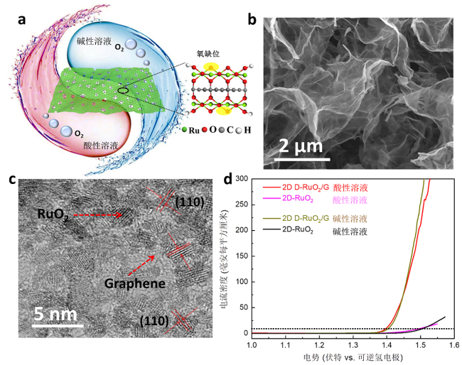 近日,大連化物所催化基礎(chǔ)國家重點實驗室二維材料化學(xué)與能源應(yīng)用研究組(508組)吳忠?guī)浹芯繂T團隊開發(fā)出一種具有本征缺陷結(jié)構(gòu)的氧化釕/石墨烯二維異質(zhì)結(jié)催化劑,實現(xiàn)了在全pH范圍內(nèi)高活性、高穩(wěn)定的電解水析氧。