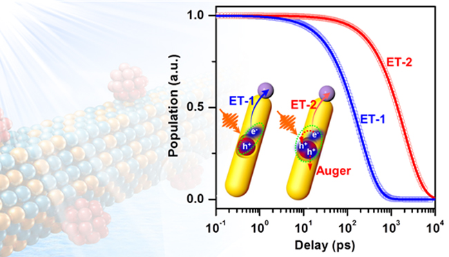 近日,大連化物所光電材料動力學(xué)創(chuàng)新特區(qū)研究組(11T6組)吳凱豐研究員團(tuán)隊(duì)采用三脈沖飛秒瞬態(tài)吸收光譜,以量子限域的納米棒-金屬異質(zhì)結(jié)作為模型體系,揭示了納米尺度多電荷轉(zhuǎn)移中的庫侖勢壘和效率瓶頸。
