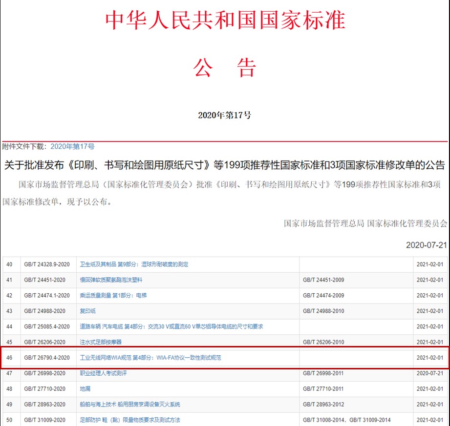 近日,由中國科學(xué)院沈陽自動(dòng)化研究所牽頭制定的“工業(yè)無線網(wǎng)絡(luò)WIA規(guī)范 第4部分:WIA-FA協(xié)議一致性測試規(guī)范”正式發(fā)布,成為中華人民共和國國家標(biāo)準(zhǔn)(國家標(biāo)準(zhǔn)編號(hào)為GB/T 26790.4-2020),并將于2021年2月1日出版實(shí)施。