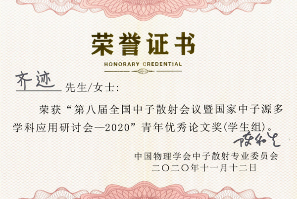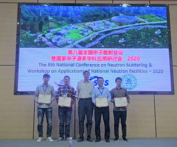 在本次會議期間,中國物理學(xué)會中子散射專業(yè)委員會組織評選了“青年優(yōu)秀論文獎”,共有包括我所2019級博士研究生齊跡在內(nèi)的四位青年人才獲此殊榮。中國物理學(xué)會中子散射專業(yè)委員會主任、中國散裂中子源工程建設(shè)總指揮和工程經(jīng)理陳和生院士親自為獲獎人頒獎并合影留念。