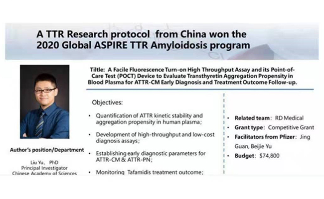 輝瑞ASPIRE Award通過國際專家函評,篩選并支持全球優(yōu)秀青年科學(xué)家針對重大疾病的發(fā)病機(jī)制、治療和預(yù)防等方面開展相關(guān)轉(zhuǎn)化醫(yī)學(xué)研究。大連化物所參評的“轉(zhuǎn)甲狀腺素蛋白淀粉樣變的早期診斷方法”為中國區(qū)今年唯一入選成果。