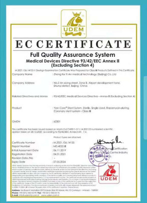 2021年1月4日,由我負(fù)責(zé)全程研發(fā)、中科益安醫(yī)療科技(北京)股份有限公司生產(chǎn)的新型心血管支架產(chǎn)品獲得歐盟認(rèn)證機(jī)構(gòu)頒發(fā)的CE證書,取得了進(jìn)入歐盟國(guó)家銷售的通行證書,這將有利于產(chǎn)品在國(guó)際市場(chǎng)銷售。