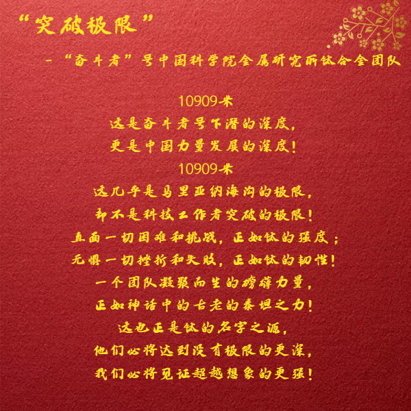 從萬米深淵到浩瀚星空,鈦合金團隊一次次創(chuàng)造奇跡。腳踏實地,默默前行,正是他們嚴謹求實、團結協(xié)作、拼搏奉獻、勇攀高峰的中國科研精神,中華民族的偉大復興才能盡早實現(xiàn)!正如項目負責人楊銳所說,“克服困難的過程中要有毅力,每個人把自己的事情干好了,這個國家就強大了!”