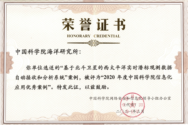 近日,中國科學(xué)院公布了“2020年度中國科學(xué)院信息化十大優(yōu)秀案例”,海洋所王凡團(tuán)隊自主建設(shè)完成的“基于北斗衛(wèi)星的西太平洋實時潛標(biāo)觀測數(shù)據(jù)自動接收和分析系統(tǒng)”成功入選。