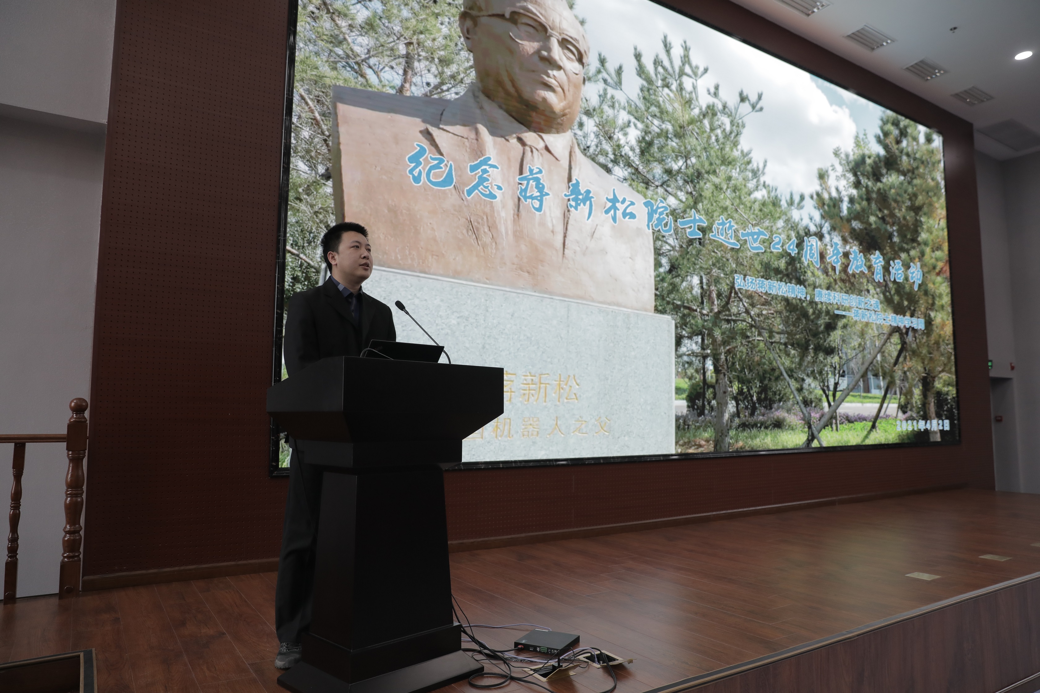 國家“載人深潛英雄”劉開周研究員和“海斗一號(hào)”萬米無人潛水器項(xiàng)目總師唐元貴研究員作為職工代表首先向蔣新松塑像敬獻(xiàn)花籃。隨后,與會(huì)人員分批向塑像獻(xiàn)花,并集體默哀寄托哀思。隨后,與會(huì)人員前往報(bào)告廳集體觀看了《中國機(jī)器人之父——蔣新松》短片。黨委副書記孫雷以《請(qǐng)接受一個(gè)忠誠于你的戰(zhàn)士的申請(qǐng)》為題分享了蔣新松入黨申請(qǐng)書節(jié)選。蔣新松在滿滿七頁稿紙中,向黨組織誠懇報(bào)告了33年來的心路歷程和人生思考,展現(xiàn)了對(duì)黨忠貞不渝的信念,對(duì)科研事業(yè)永恒探索的精神。