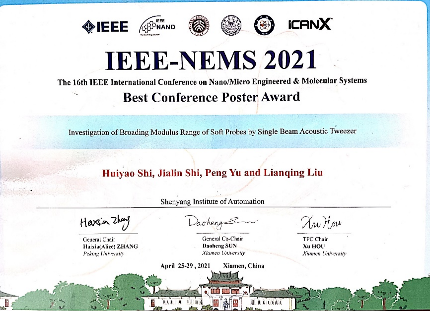 近日,第16屆微納工程與分子系統(tǒng)國際研討會(the 16th IEEE International Conference on Nano/Micro Engineered & Molecular Systems:IEEE-NEMS2021)國際會議在廈門舉行。中國科學院沈陽自動化研究所博士生石慧瑤等撰寫的論文Investigation of Broading Modulus Range of Soft Probes by Single Beam Acoustic Tweezer脫穎而出,獲得最佳會議海報獎。