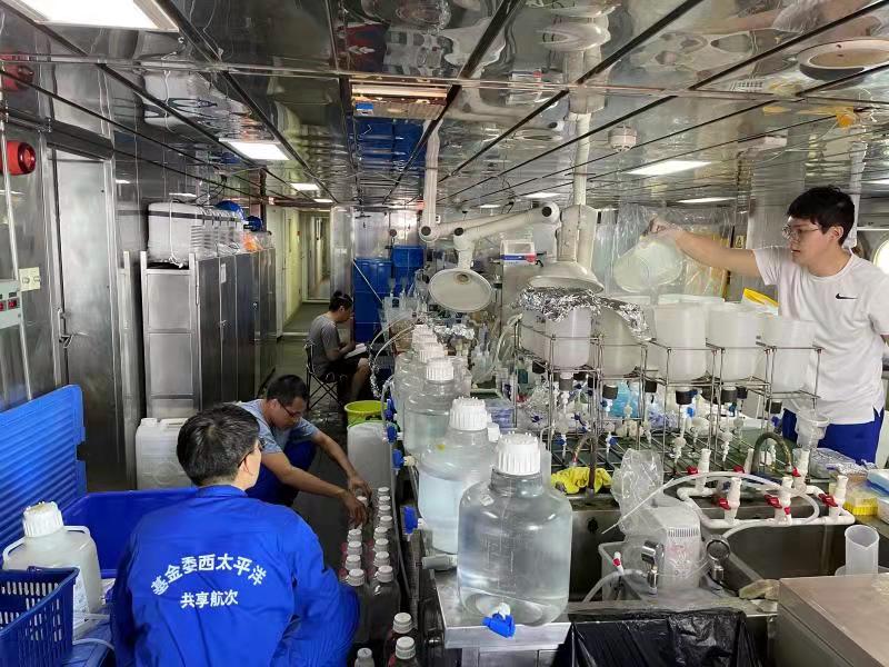 科考隊(duì)員在船載實(shí)驗(yàn)室對(duì)獲取的海水樣品進(jìn)行初步處理