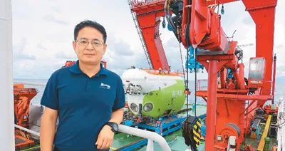 海試期間,趙洋在萬米級載人潛水器“奮斗者”號前留影