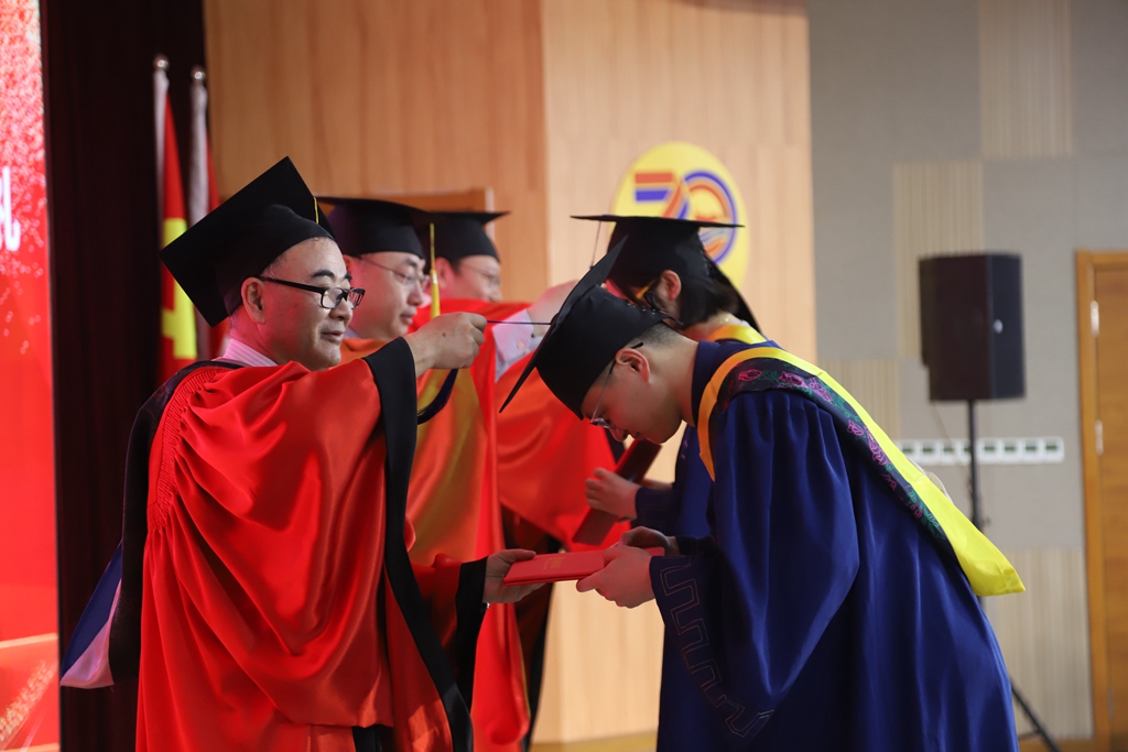 所領(lǐng)導(dǎo)為畢業(yè)生扶流蘇、頒發(fā)學(xué)位證書