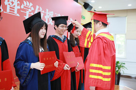 在歡快的樂曲聲中,畢業(yè)生導師親自為學生頒發(fā)了畢業(yè)證書,呂雪峰為畢業(yè)生一一撥穗扶正流蘇,授予學位。
