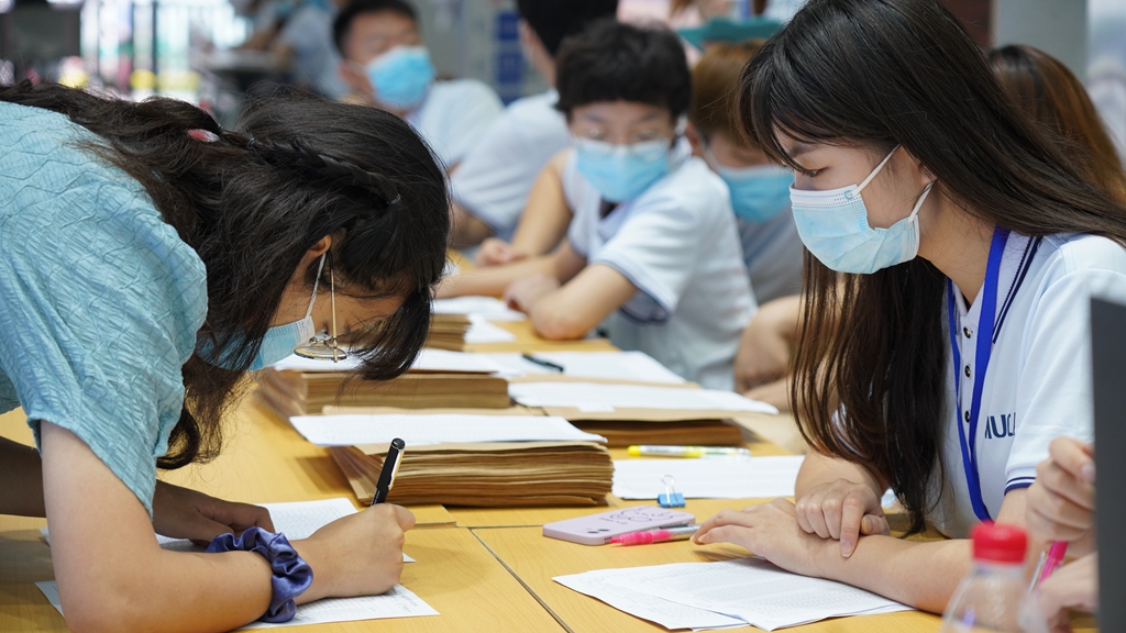 新生在志愿者引導(dǎo)下入住研究生公寓