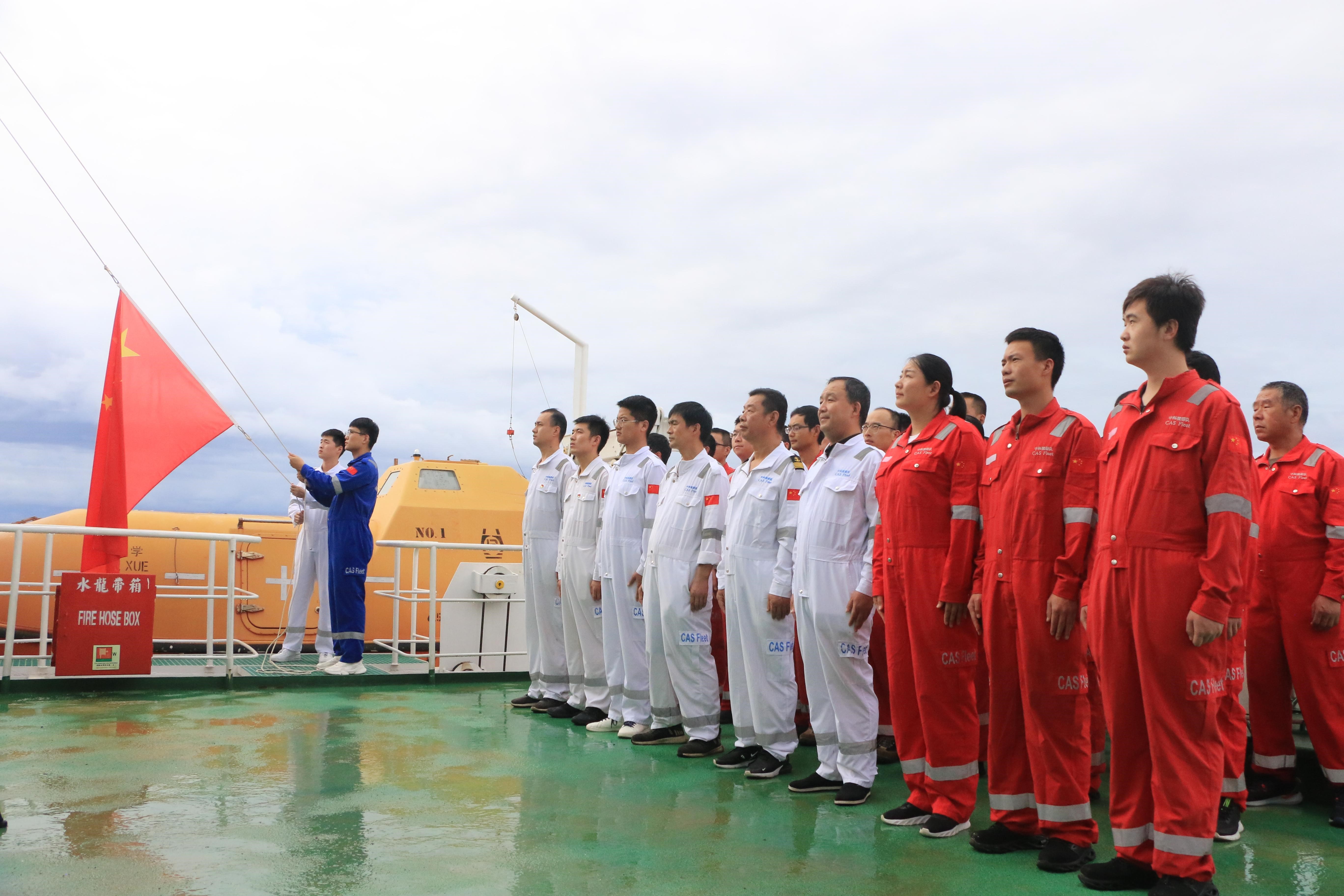 為慶祝中華人民共和國成立72周年,10月1日,正在西太平洋執(zhí)行科考任務(wù)的“科學(xué)”號(hào)考察船,迎著清晨的第一縷陽光舉行迎國慶升國旗儀式。