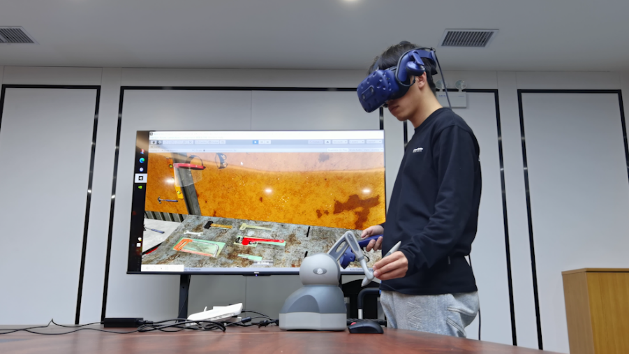 沈陽自動化所SIA_Touchable參賽團(tuán)隊(duì)基于VR頭顯、Touch觸感終端等設(shè)備,以Unity為引擎,搭建了集成“視觸聽”多維立體化感知的VR無線系統(tǒng)。作品在虛擬世界中,真實(shí)還原了沈陽自動化所的原貌,設(shè)計(jì)了虛擬的智能工廠,可以支持6DOF的全視角VR體驗(yàn),提供摩擦力、重力、粘性力、彈簧力、震動等5種力觸覺感知,提供40余個(gè)工具零部件和設(shè)備的虛擬操控。通過與5G技術(shù)結(jié)合,可為工程師提供視覺、聽覺之外的觸覺感知,獲得更高的沉浸感,支持工程師的設(shè)備檢修、維護(hù)、觸感遙操作等創(chuàng)新應(yīng)用。