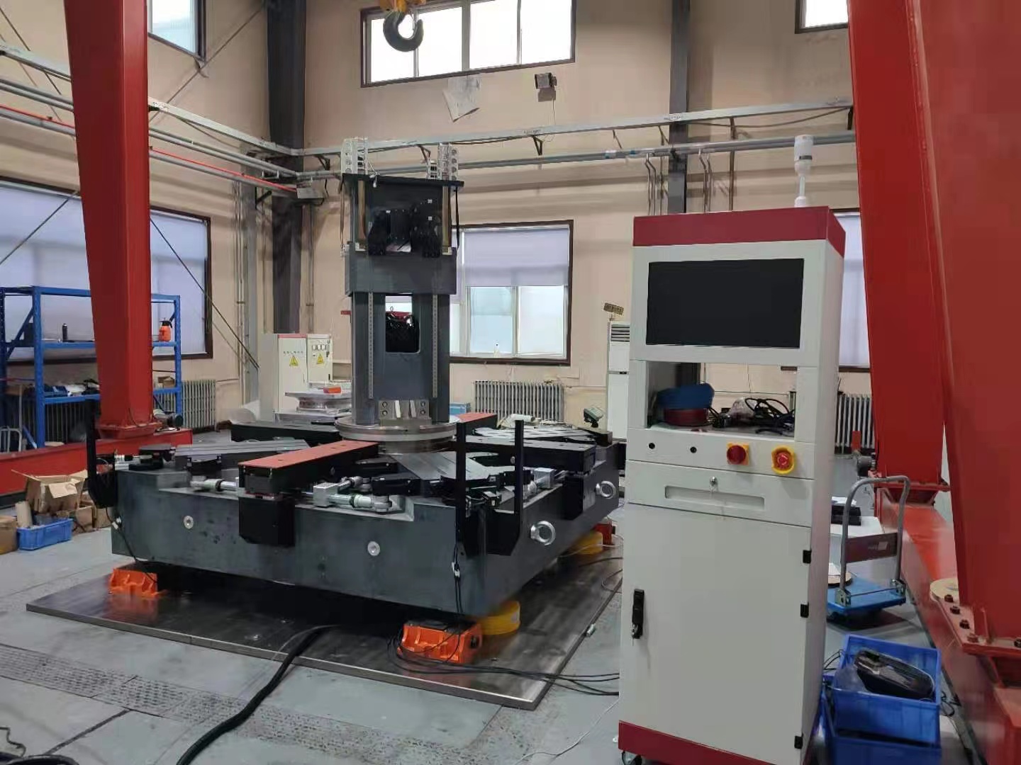 沈陽自動化所智能檢測與裝備研究室IDE團(tuán)隊提出的高負(fù)載大可變量程的大型圓柱度測量新方法采用具有精密、隔震等特性的氣浮驅(qū)動技術(shù),配合精密耦件,通過測前快速自適應(yīng)偏置調(diào)整技術(shù)實現(xiàn)工件測前自動定心,采用精密測頭回轉(zhuǎn)的方式快速獲取有效測量信息。在測量原理方面,提出了更完善的圓柱度測量模型及誤差分離算法,測前定心與實際測量采用分立的運動控制系統(tǒng),既解決了大型工件的載荷問題,又能夠通過模型參數(shù)擬合的方式實現(xiàn)偏心、測量線偏置、被測圓柱軸傾斜等誤差的精準(zhǔn)分離;測量系統(tǒng)采用對稱式雙測頭測量方案,綜合了非接觸式位移傳感器安全、柔性的特點與接觸式位移傳感器精密、可靠的特性。本方法的提出突破了傳統(tǒng)測量方法在大型圓柱度測量過程中的局限性,實現(xiàn)了大型回轉(zhuǎn)類零件圓柱度測前自適應(yīng)偏置調(diào)整和現(xiàn)場快速精密測量。
