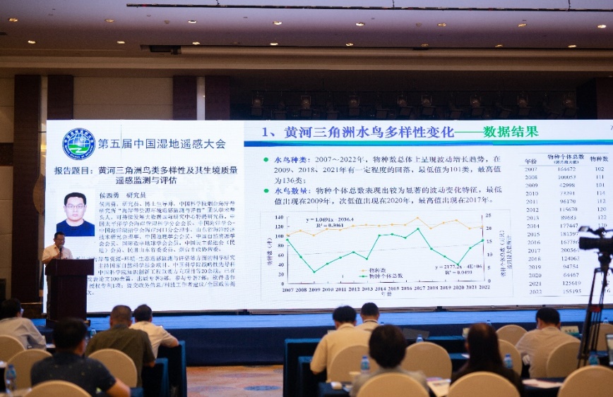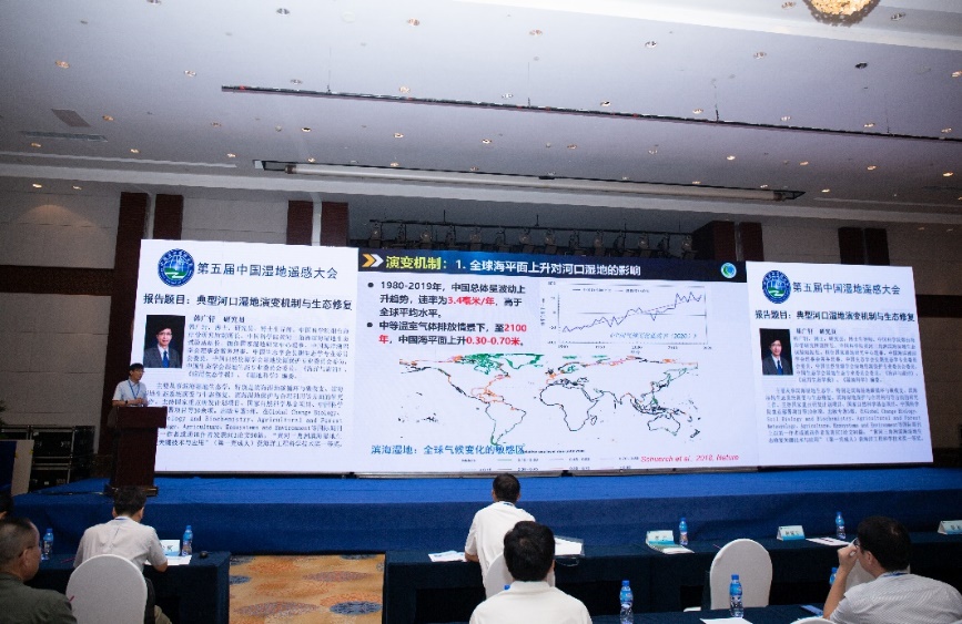 大會特邀報告環(huán)節(jié)中國科學(xué)院成都生物研究所副所長陳槐研究員、中國科學(xué)院煙臺海岸帶研究所副所長韓廣軒研究員、中國科學(xué)院東北地理與農(nóng)業(yè)生態(tài)研究所副所長王宗明研究員、中國科學(xué)院煙臺海岸帶研究所邢前國研究員、自然資源部第二海洋研究所張華國研究員、寧波大學(xué)孫偉偉教授以及中國科學(xué)院煙臺海岸帶研究所侯西勇研究員分別作了題為“泥炭地碳動態(tài)與全球變化”“典型河口濕地演變機制與生態(tài)修復(fù)”“中國濕地土壤有機碳儲量時空特征”“我國近海大型海藻遙感及其藍碳貢獻評估”“太平洋島嶼國家海岸帶與海島生態(tài)環(huán)境遙感應(yīng)用”“濕地植物多樣性遙感監(jiān)測研究進展與展望”以及“黃河三角洲鳥類多樣性及其生境質(zhì)量遙感監(jiān)測與評估”的主旨報告。大會特邀報告環(huán)節(jié)由煙臺海岸帶所侯西勇研究員和魯東大學(xué)資源與環(huán)境工程學(xué)院吳孟泉教授共同主持。