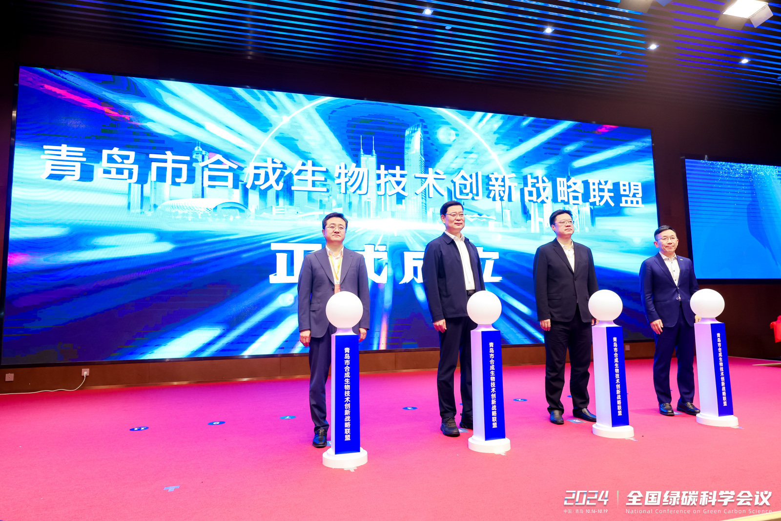 王波受邀代表青島市委、市政府,祝恩元受邀代表山東省科學(xué)技術(shù)廳,冷雨欣受邀代表中國科學(xué)院重大科技任務(wù)局分別致辭。呂雪峰受邀擔(dān)任本次大會(huì)主席并發(fā)表致辭。會(huì)上,由青島市科學(xué)技術(shù)局指導(dǎo),青島能源所聯(lián)合有關(guān)企業(yè)、高校和科研院所組建的“青島市合成生物技術(shù)創(chuàng)新戰(zhàn)略聯(lián)盟”正式成立,青島萬源環(huán)境科技有限公司、山東金智瑞新材料發(fā)展有限公司、山東環(huán)保發(fā)展集團(tuán)有限公司、青島中創(chuàng)匯科生物科技有限公司、青島中科綠碳技術(shù)有限公司、山東恒信集團(tuán)有限公司、青島中科源本新能源有限公司、中國氫能公司(能量魔方(青島)數(shù)據(jù)科技有限公司)分別與研究所完成簽約。