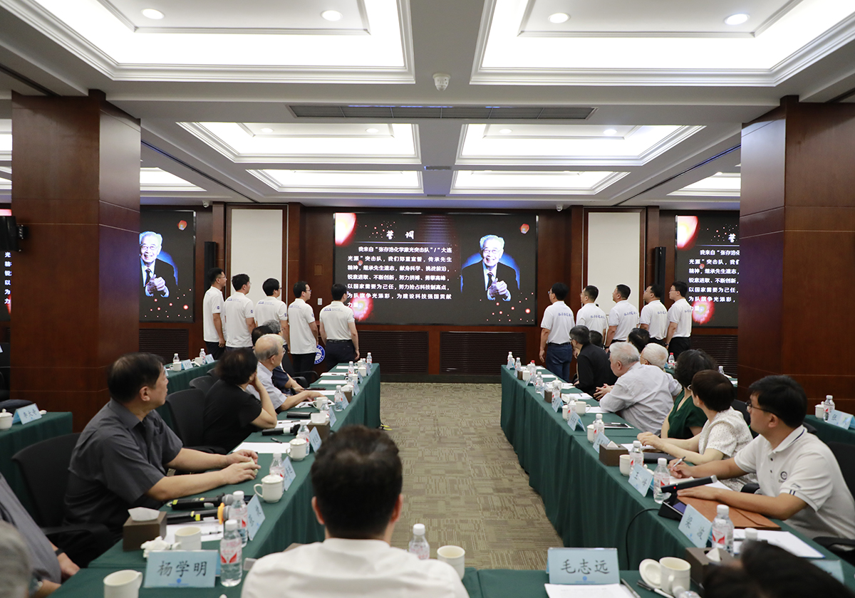 最后,追思會“傳承”環(huán)節(jié)上,大連化物所“張存浩化學(xué)激光突擊隊”和“大連光源突擊隊”代表現(xiàn)場重溫了誓詞:“我們鄭重宣誓,傳承先生精神,繼承先生遺志,獻身科學(xué)、挑戰(zhàn)前沿,銳意進取、不斷創(chuàng)新,努力拼搏、勇攀高峰,以國家需要為己任,努力搶占科技制高點,為隊旗增光添彩,為建設(shè)科技強國貢獻力量?!笔难藻P錚,矢志報國,以張存浩先生精神為引領(lǐng),為建設(shè)科技強國竭盡全力,這是對張存浩精神最好的傳承與發(fā)揚,也是對先生最好的追思和懷念。
