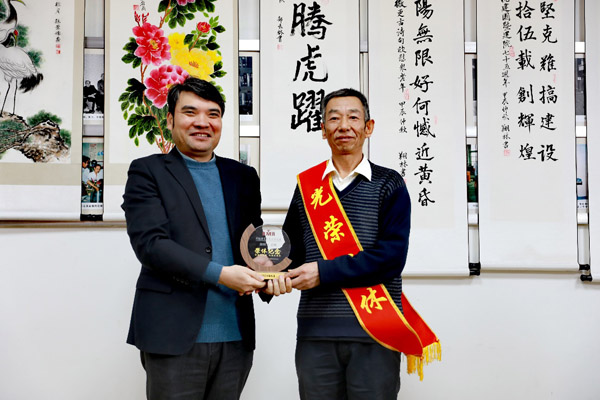 陳星秋為退休職工代表?xiàng)顟延裱芯繂T頒發(fā)“榮休紀(jì)念牌”